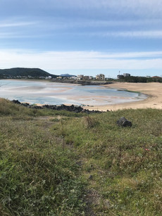 When I got to the beach there were a few other families there, but it was still fairly quiet. The rocks on the edge of the water were super cool and there were lots of people taking pictures on them. Someone had also written 'Happy Birthday Jimin' in the sand so I took a quick video of that. The temperature was nice out and I decided to continue walking along the beach to get to my final stop.