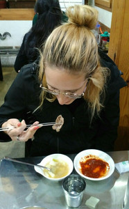 It was probably the best soup I’ve ever had! It was a little hard to eat the chicken with chopsticks but everything was amazing. Since they had the whole chicken in the soup they also gave each table a bucket to put the bones in after eating. There were potatoes, rice cakes, and leeks in the soup as well and I was so excited to eat more rice cakes. Each person also got a little dish where we could create our own sauce. There were different sauces on the table that we could mix together including red pepper and garlic paste, vinegar, soy sauce, and a couple other things. It was such an amazing dish and definitely something I would recommend to anyone going to Seoul!