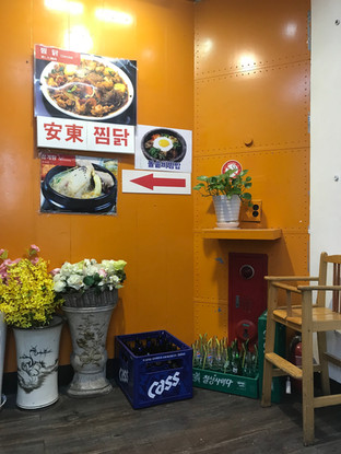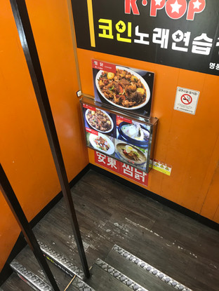 It was almost 3 pm by this point and I hadn't had lunch so I stopped by a place that had a picture of bibimbap outside of it. I think I mentioned in a previous post but the majority of restaurants have pictures of the main dishes they serve on the wall or window outside. I find it super convenient because I don't have to go in or take time to look at a menu, I can just glance at the window and see what kind of food they serve. Another thing that is cool is that there are lots of stores and not a lot of space so it is very unusual to see a building that has only one store in it. Typically the building is 3 or 4 floors and there are signs on the walls outside advertising what is on each floor. There is a main entrance to a stair case that allows people to access all the other floors in that building. Here is the place that I stopped at for lunch (it was on the second floor):