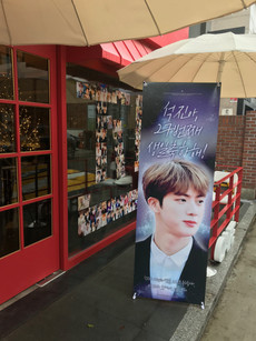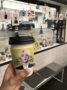 The cafe even had cup sleeves because it was almost Jin's birthday. One fan site was saying Jin's brother organized it and another was saying someone else organized it so who knows who actually did, but it was nice to get a cup sleeve without having to drink more tea.