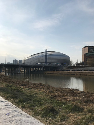 I have learned over the past few weeks that some fan sites will give away photo cards or other small gifts before the concert. In order to get the gifts all I had to do was follow and retweet a specific tweet. They release the location they will be waiting at on the day of the concert and people can meet them there. One of the fan sites said she would be giving away items starting at 1 pm so I decided to go to the concert venue around that time. I arrived around 1 and went down to the river to find the fan sites. There were huge line ups of fans all along one side of the river and I had no idea what it was for, I just hoped I didn't need to be there as well. The fan sites were on the other side of the water so I walked over a little rock bridge to find them.